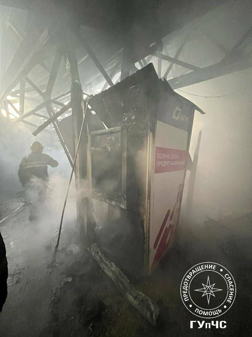 Пожаром было охвачено 150 квадратных метров. Полностью сгорели банкомат и два бутика. Сильно пострадала мягкая кровля и ветровые стекла рынка.