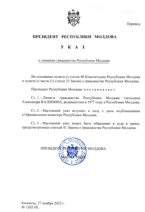 Отмечается, что документ подписан на основании статьи 23 (1) с) – «указом президента гражданства Республики Молдова может быть лишено лицо, совершившее особо тяжкое деяние, нанесшее значительный ущерб государству, доказанный судебной инстанцией».