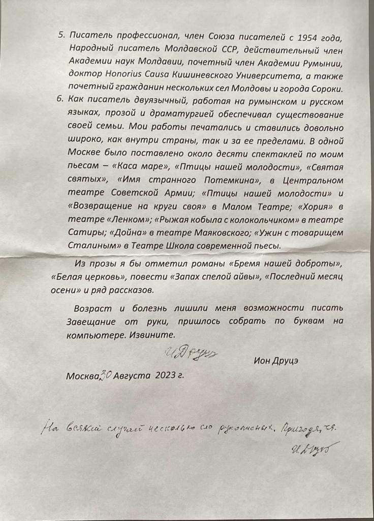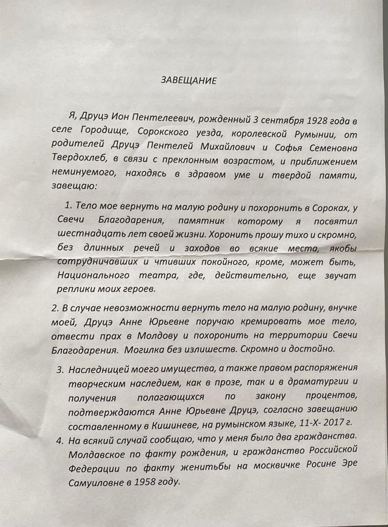Молдавской писатель Ион Друцэ умер 28 сентября в Москве. 30 августа 2023 года писатель оставил завещание, в котором попросил вернуть его тело на малую родину и похоронить в Сороках.