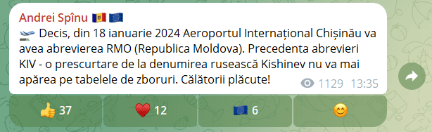 «С 18 января 2024 года аббревиатура Международного аэропорта Кишинева станет RMO (Республика Молдова). Нынешняя аббревиатура KIV – сокращенно от русского названия Кишинев – больше не будет появляться на табло полетов», — сообщил вице-премьер Андрей Спыну.