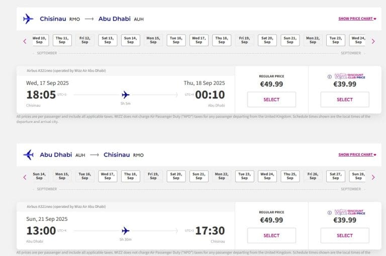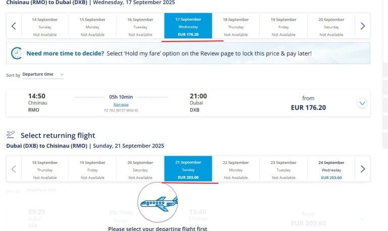 В частности, за билет эконом-класса по маршруту Кишинев–Дубай 17 сентября пассажирам придется заплатить 176 евро. В обратном направлении, вылет намечен на 21 сентября, билет обойдется в 203 евро, что означает, что поездка туда и обратно обойдется в более чем 370 евро.