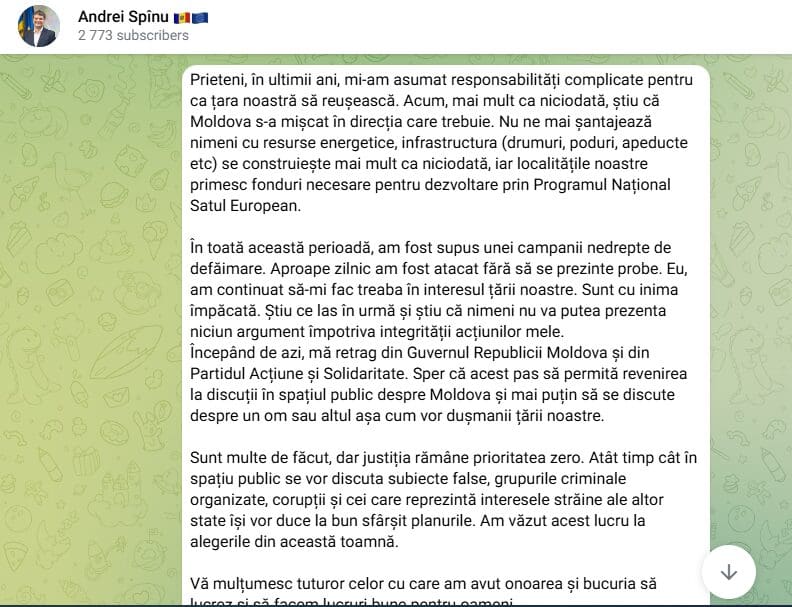 С сегодняшнего дня я выхожу из состава правительства Республики Молдова и из Партии действия и солидарности. Надеюсь, что этот шаг позволит вернуться к публичным дискуссиям о Молдове и меньше говорить о том или ином человеке, как того хотят враги нашей страны», — написал Андрей Спыну.