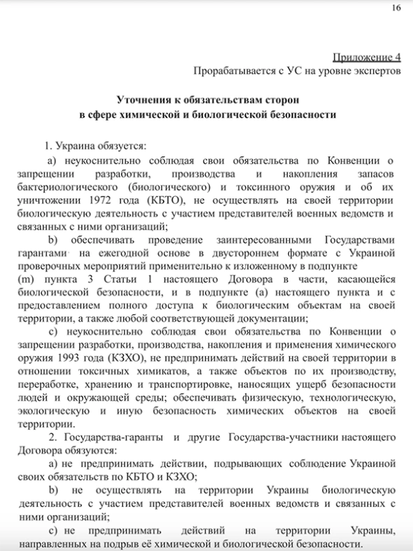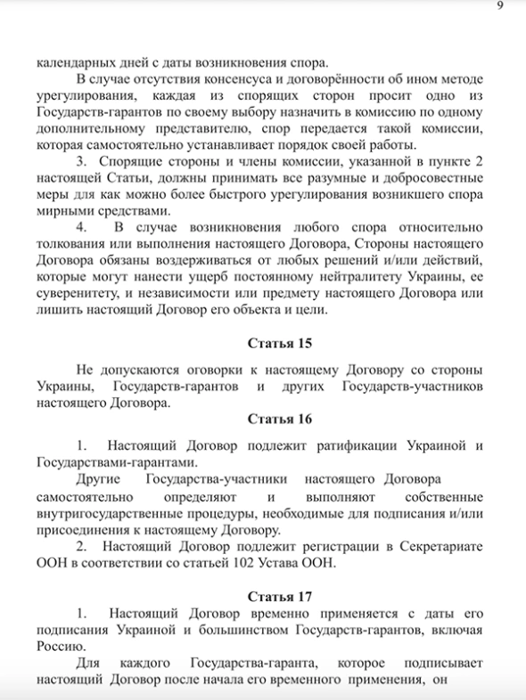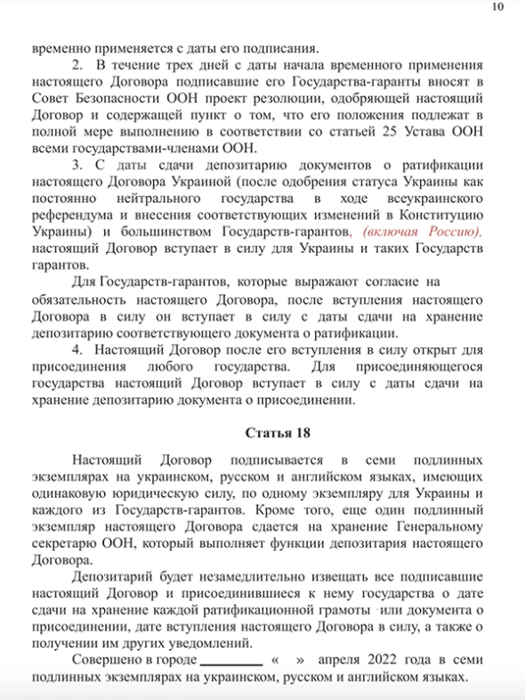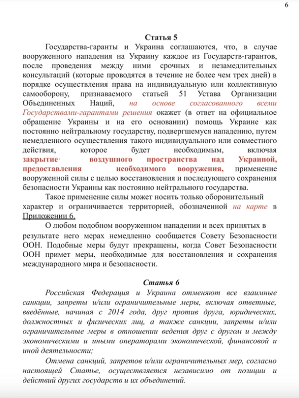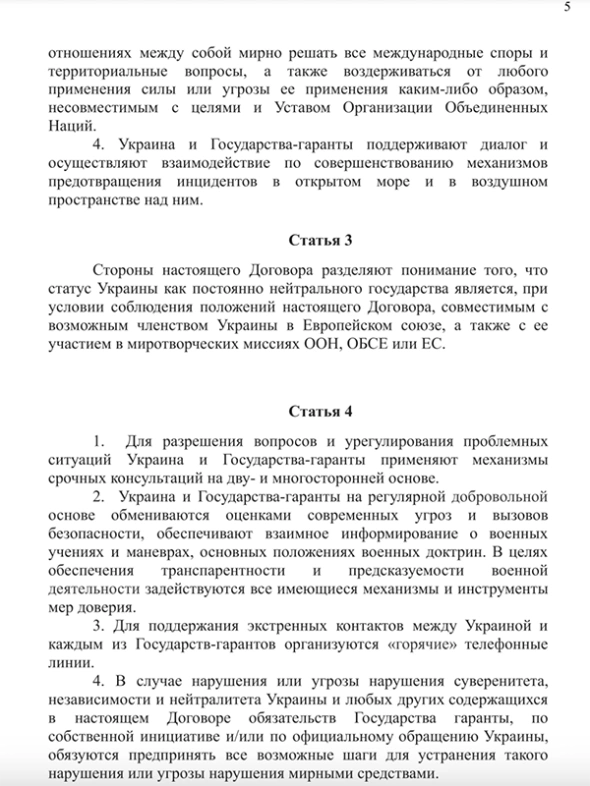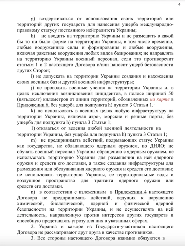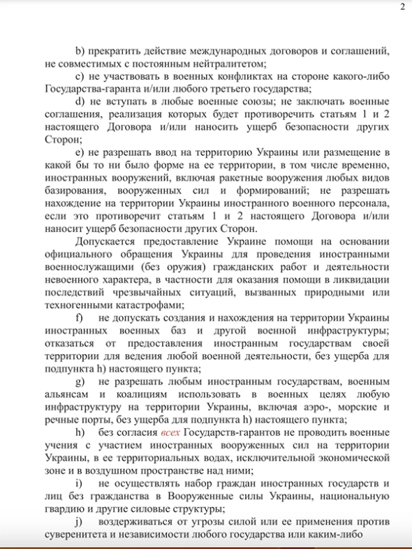 Согласно тексту, Украина не может вступать в НАТО и другие военные альянсы. Также Украина не должна воевать на стороне одного из гарантов ее безопасности, которыми в тексте указаны Великобритания, Китай, США, Франция и Россия (в скобках также фигурируют Беларусь и Турция).