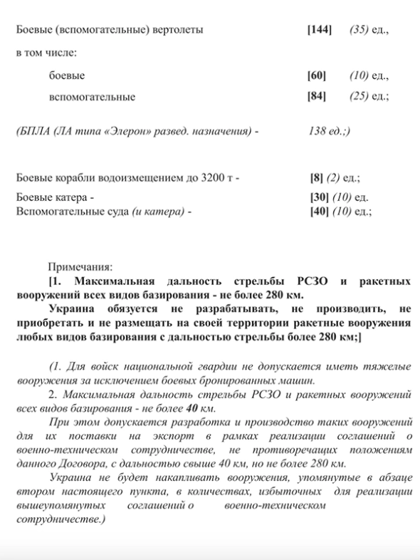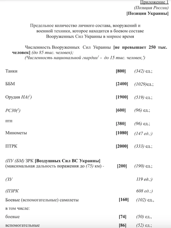 В приложении к договору указано предельное количество личного состава и вооружений, которое может быть у Украины в ее предполагаемом нейтральном статусе. Личный состав ограничивался в 250 тысяч человек.