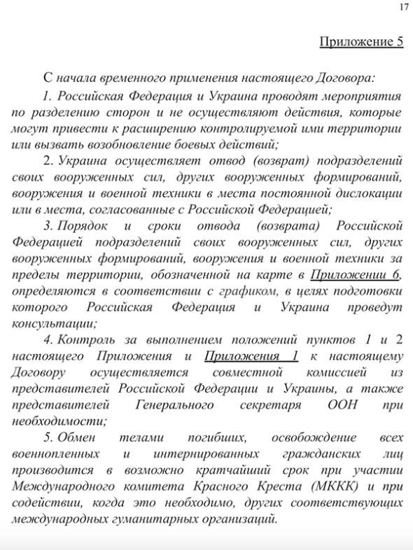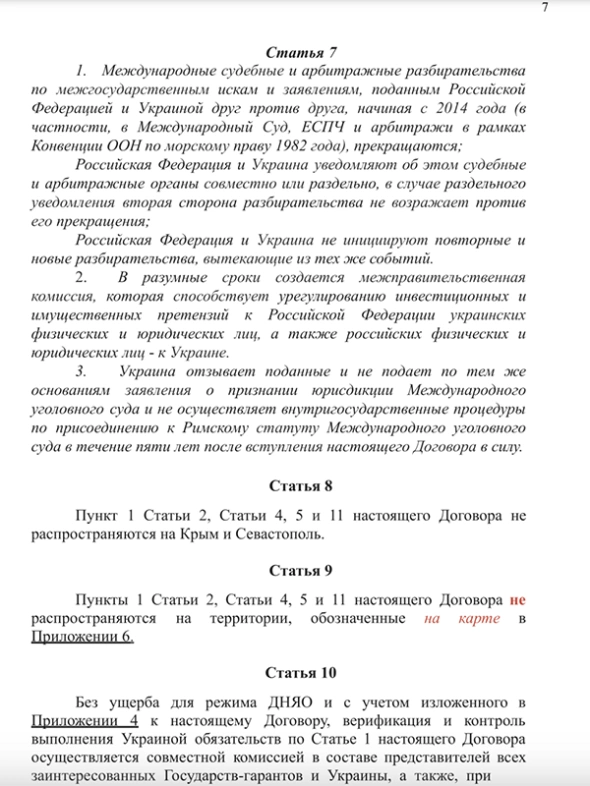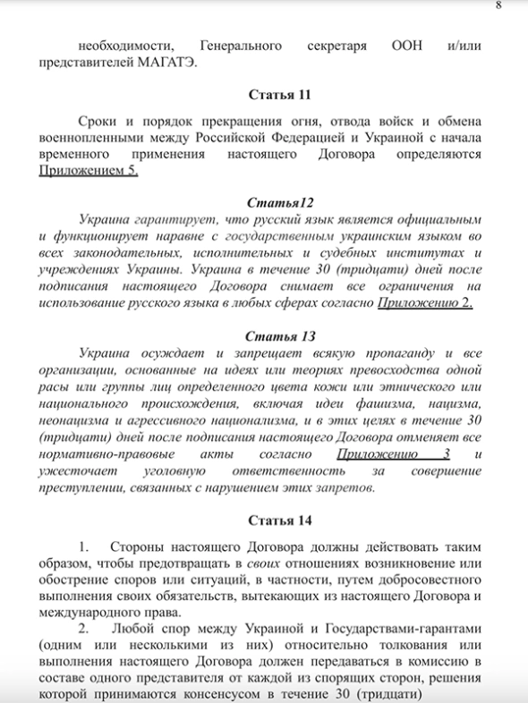 Также в тексте документа указано, что Украина и РФ должны отменить все взаимные санкции и запреты. Однако при этом действие договора не распространяется на территорию Крыма и Севастополя, которые Россия аннексировала в 2014 году. Еще одна статья соглашения подразумевает, что русский язык в Украине должен быть наделен статусом государственного.