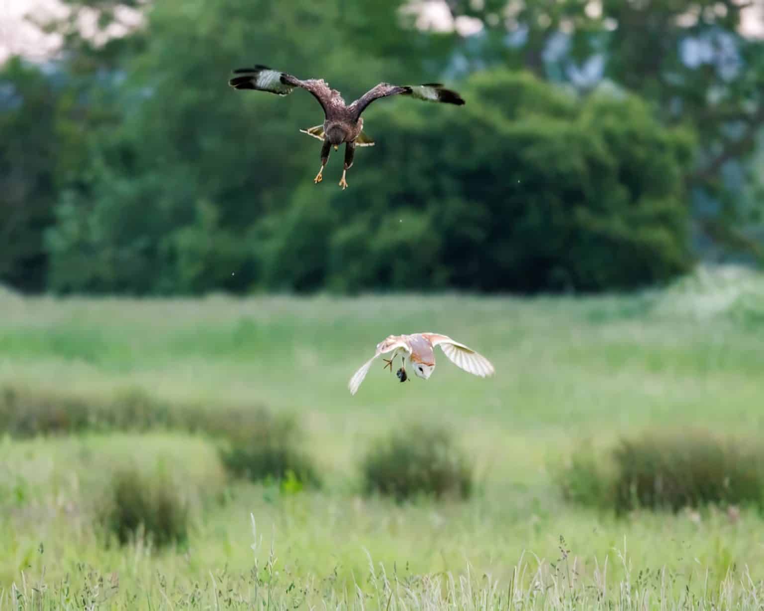 Британский фотограф дикой природы Джек Лодж несколько вечеров наблюдал за сипухами, отправляющимися на охоту. Однажды он стал свидетелем драматичной сцены, когда сипуха сама стала добычей ястреба.
