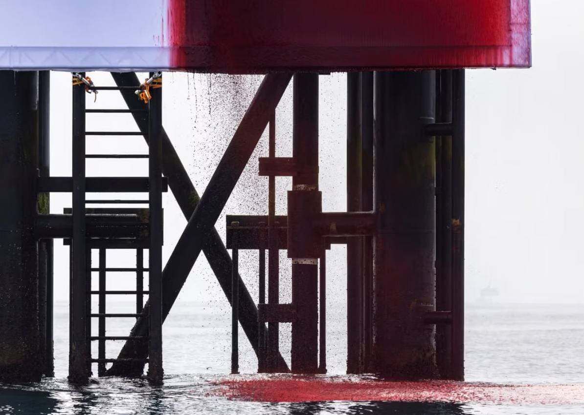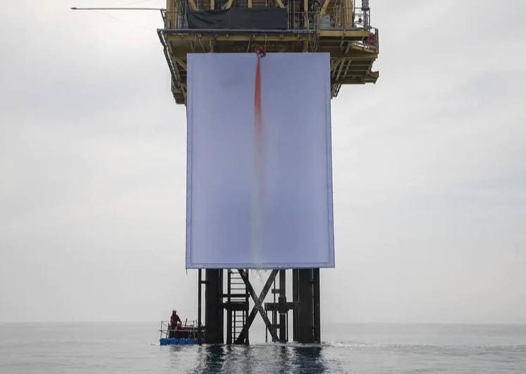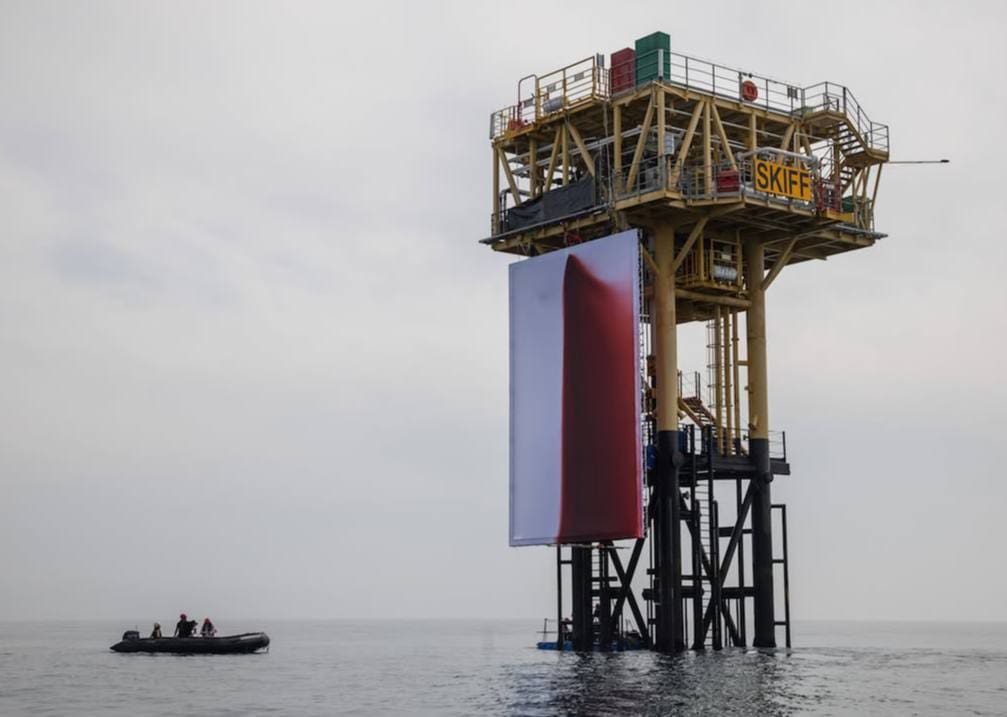 Greenpeace организовал арт-протест на платформе Shell Skiff. Активисты установили на газодобывающей платформе в Северном море большое полотно с произведением Аниша Капура «Зарезанный».