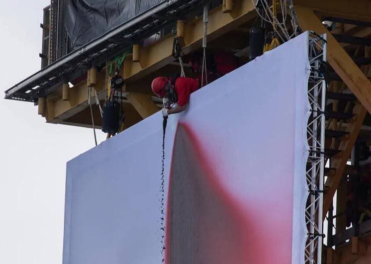 Конструкция 12×8 метров была залита тысячей литров красной жидкости, напоминающей кровь, – смесью морской воды, свекольного порошка и пищевого красителя.