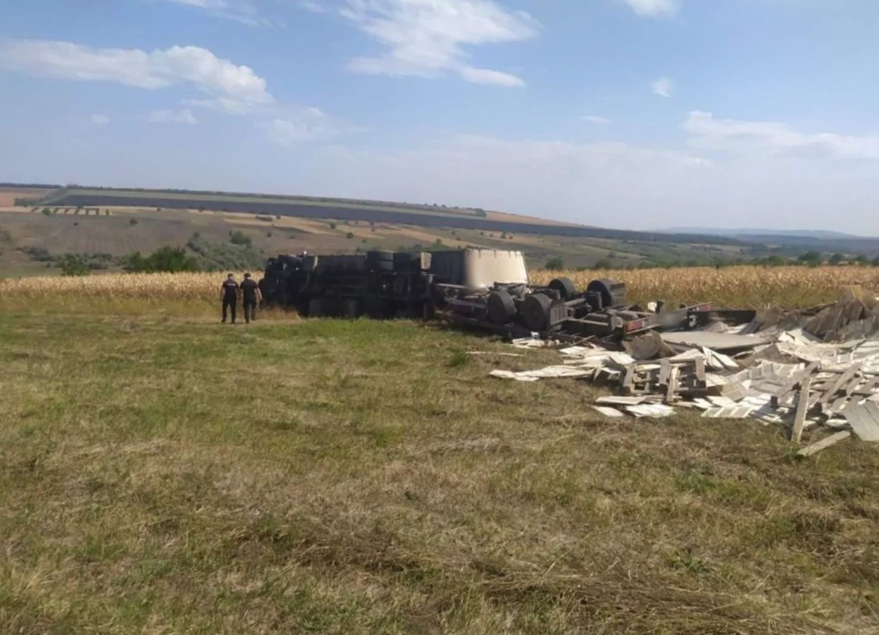 Грузовик с более чем десятью тоннами досок для ящиков перевернулся на сельскохозяйственных угодьях в селе Биличений Векь Сынжерейского района. Авария произошла в пятницу, 6 сентября, около 12:40.
