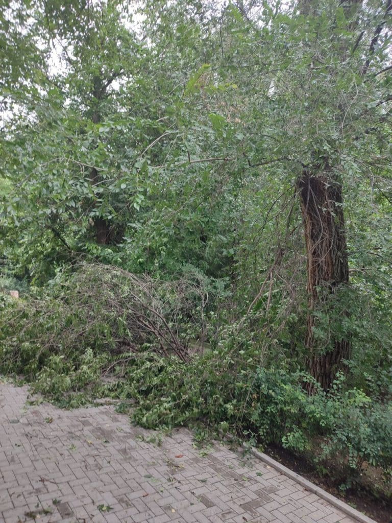 На кадрах видно, что упавшее дерево переклыла лестницу, еще одна ветка упала рядом с детской площадкой. К счастью, никто не пострадал.