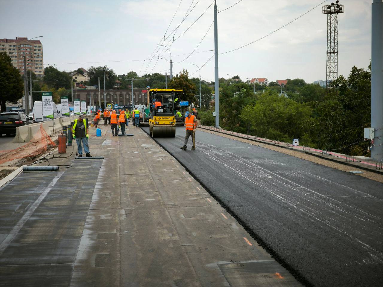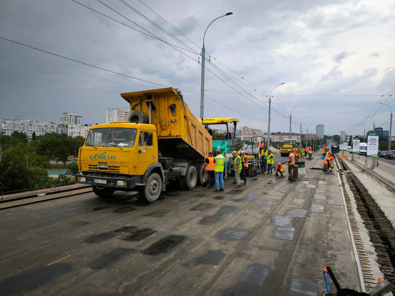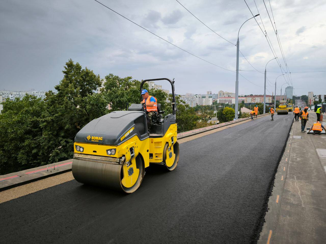На мосту по улице Михая Витязула уложен первый слой асфальта, выравнивающий, в среду предполагается нанести слой износа на всю капитально ремонтируемую часть моста.