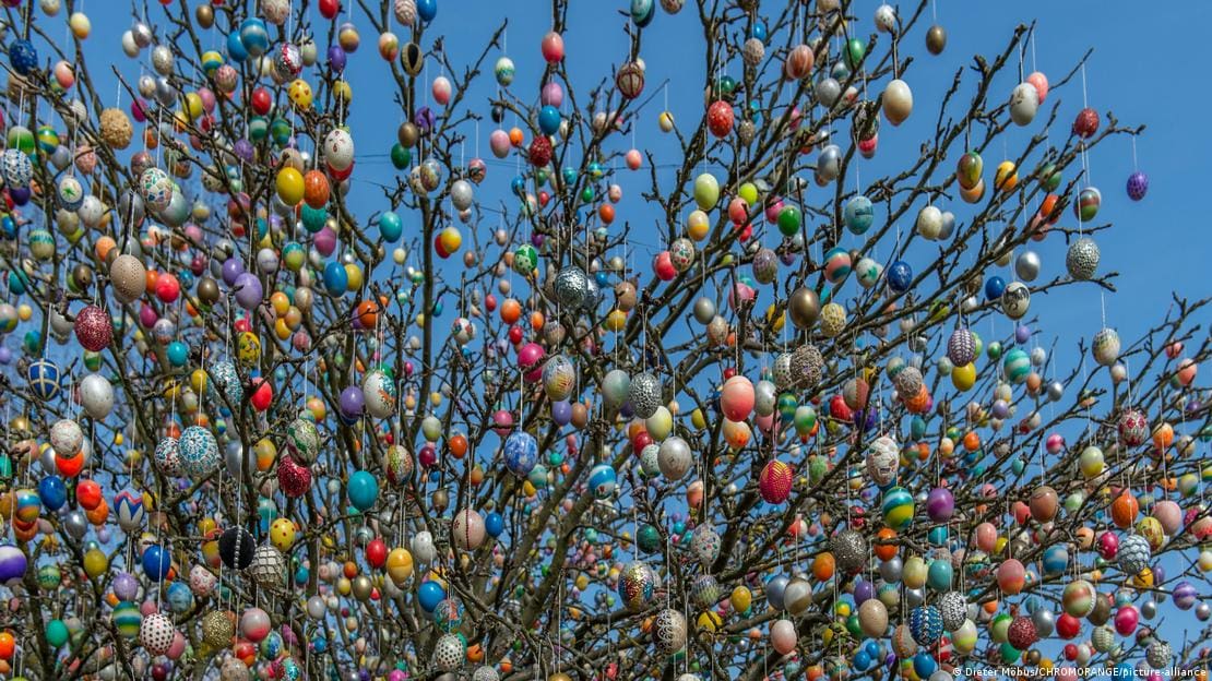 В Германии можно увидеть и необычные украшения — пасхальные деревья, увешанные сотнями разноцветных яиц, а также фонтаны и колодцы, декорированные к празднику.