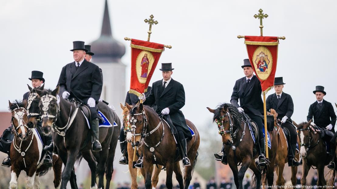 В этих же регионах проходят и пасхальные конные процессии: всадники в праздничной одежде объезжают деревни, исполняя религиозные песнопения и благословляя поля.