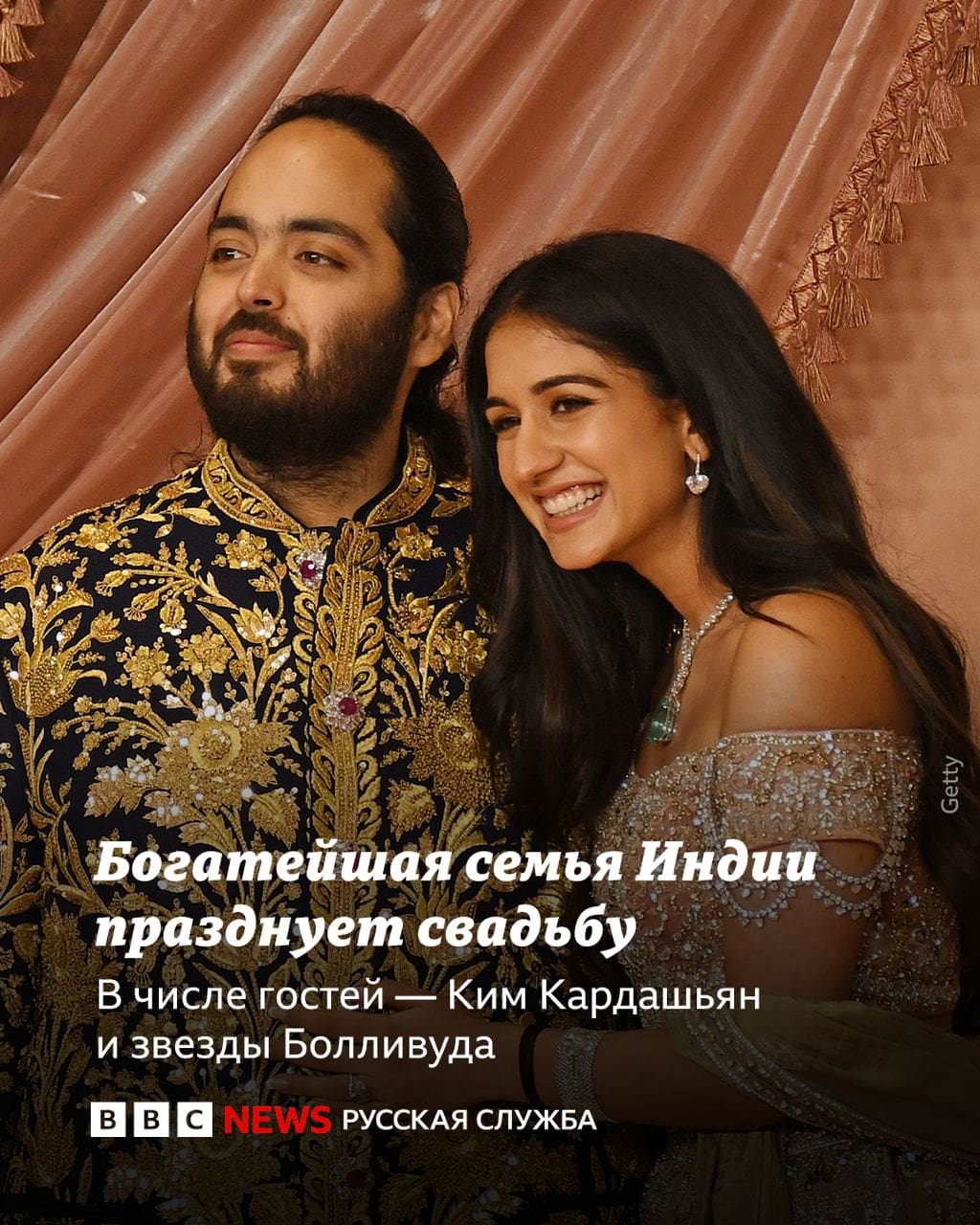 В Индии с большим размахом празднует свадьбу семья богатейшего человека страны — бизнесмена Мукеша Амбани. Его сын 29-летний Анант Амбани в пятницу женился на своей сверстнице Радике Мерчант, дочке миллиардера Шри Вирена Мерчанта, пишет bbc.news