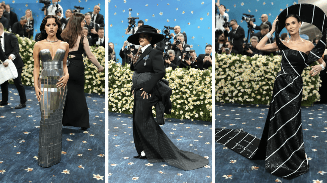 Дженна Ортега, которая сыграла в свое время главную роль в сериале «Уэнсдэй» была на балу в металлическом, облегающем платье от Balmain, созданном из линеек, которыми пользуются портные. Образ дополняют украшения от Grown Brilliance и Hearts On Fire.