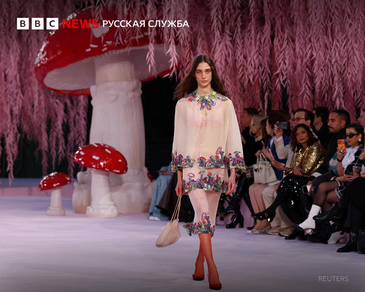 В столице Франции состоялся показ новой коллекции весна–лето 2026, разработанной дизайнером Матье Блази для Chanel. Гостей ожидали впечатляющие декорации внутри дворца Гран-Пале: лес, населенный гигантскими грибами различных форм и размеров, ставшими центральной темой показа, а также розовые плакучие ивы, создававшие особую атмосферу мероприятия.