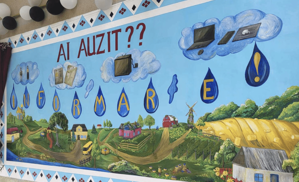 Ai auzit? — гласит надпись на мурале. Кроме того, на стене изображены различные источники информации, такие как радио телевидение, социальные сети, газеты.
