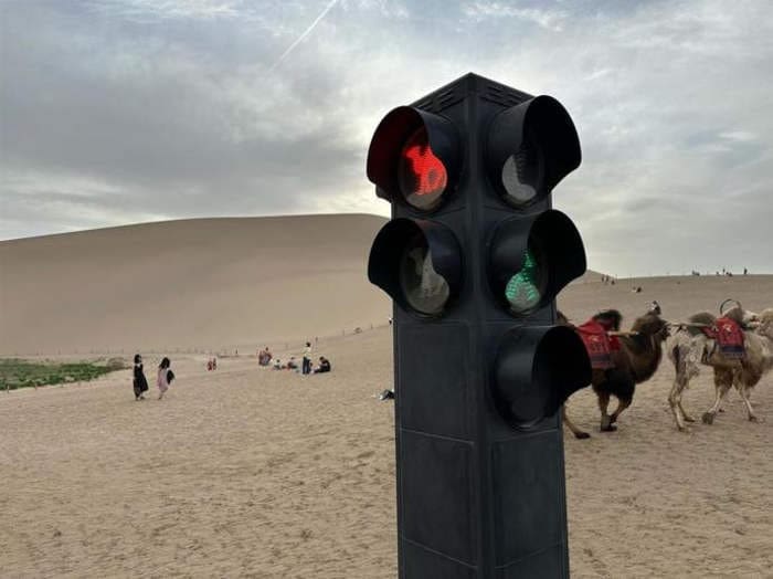 В китайской пустыне Кумтаг установили «верблюжьи светофоры. Это нужно, чтобы избежать пробок, связанных с популярностью катаний на «кораблях пустыни».