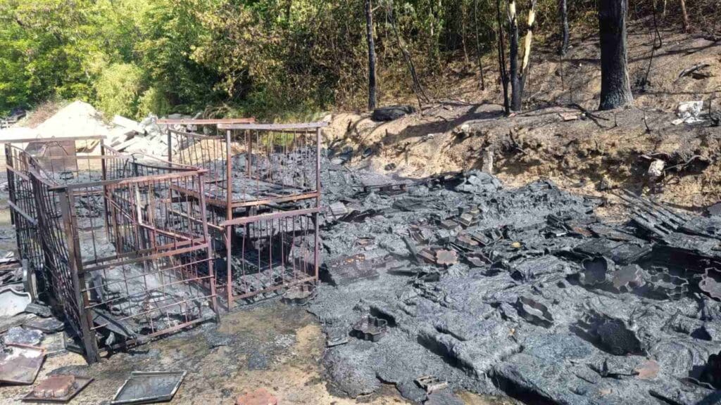 Звонок в Службу 112 поступил в 10:39. По предварительной информации, огонь охватил пластиковые изделия, находившиеся в контейнере. На место происшествия были направлены три расчета спасателей и пожарных. Прибыв на место, они установили, что пламя распространилось на площади около 100 м², где находились пластиковые формы для производства терракоты.
