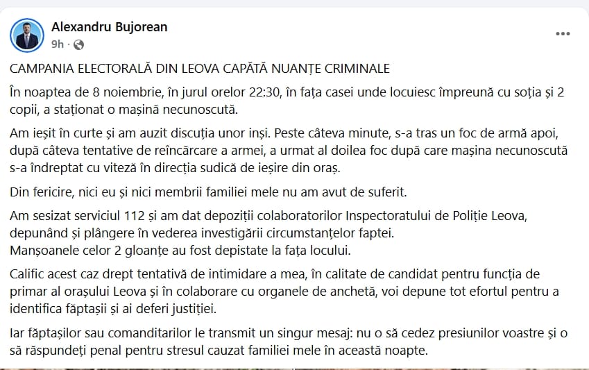 Мэр Леова и кандидат на новых местных выборах от партии LOC («Лига городов и коммун «) Александр Бужорян сообщил, что в ночь на 8 ноября возле его дома были слышны выстрелы.