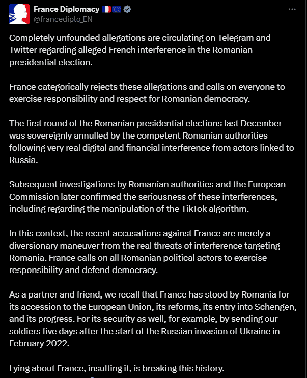 Во французском МИД подобные обвинения назвали «совершенно необоснованными» и подчеркнули, что Франция «категорически отвергает» причастность к любым попыткам повлиять на выборный процесс в Румынии.