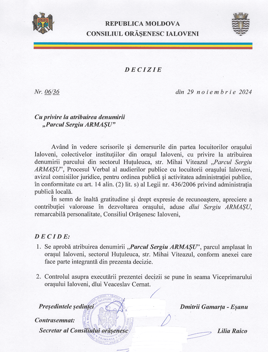 Пресса также пишет, что решение о присвоении парку имени нынешнего мэра было принято «в знак высокой благодарности и как выражение признания, оценки его ценного вклада в развитие города Яловены, внесенного Сергеем Армашу, выдающейся личностью».