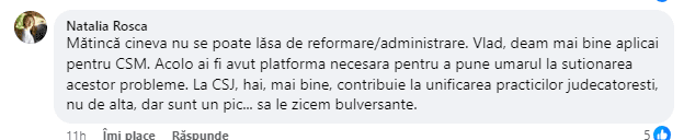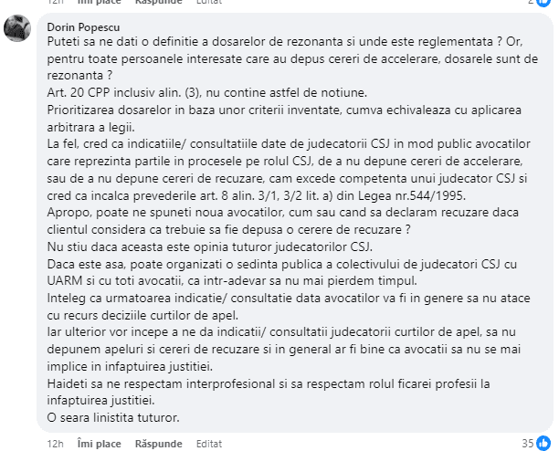 «Я думаю, что инструкции/консультации, данные судьями ВСП публично адвокатам, представляющим стороны в судебных процессах в ВСП, не подавать ходатайства об ускорении или не подавать заявления об отводе, несколько превышают компетенцию некоторых судей ВСП», — написал адвокат Дорин Попеску.
