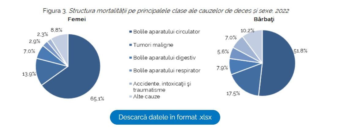 Согласно данным, 58 % зарегистрированных смертей были вызваны болезнями системы кровообращения, 16 % — злокачественными опухолями, 7,5 % — болезнями органов пищеварения, 5 % — несчастными случаями, отравлениями и травмами, 4,3 % — болезнями органов кровообращения. дыхательной системы и 9,6% от других причин (в основном смерти, вызванные COVID-19).