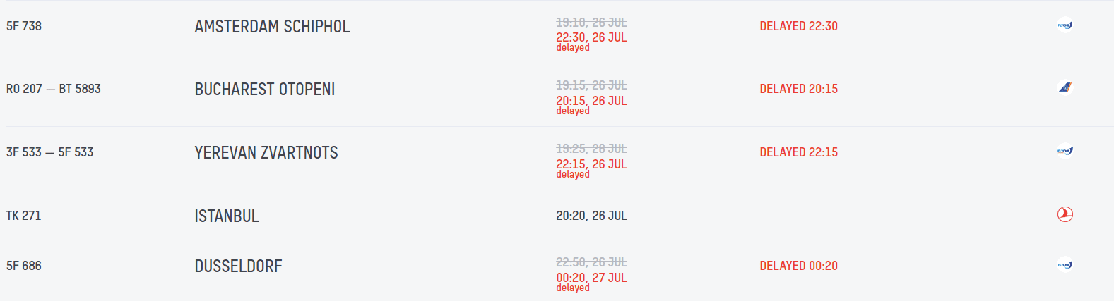 Пограничная полиция просит пассажиров рейсов, выполняемых авиакомпанией FLYONE , заранее проверять расписание рейсов. Согласно полученной информации, в среду, 26 июля 2023 г., рейсы: Кишинев-Дюссельдорф № 5F 685, Кишинев-Стамбул №. 5F 325, Кишинев-Лондон №. 5F 617 и Кишинев-Ереван №. 3F 534, задерживаются.