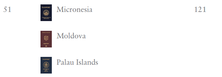 Румыния находится в этом рейтинге на 14-й позиции, наряду со своими соседями-болгарами они имеют безвизовый доступ в 177 стран. Республика Молдова находится на 51-м месте, молдаване имеют доступ в 121 страну.