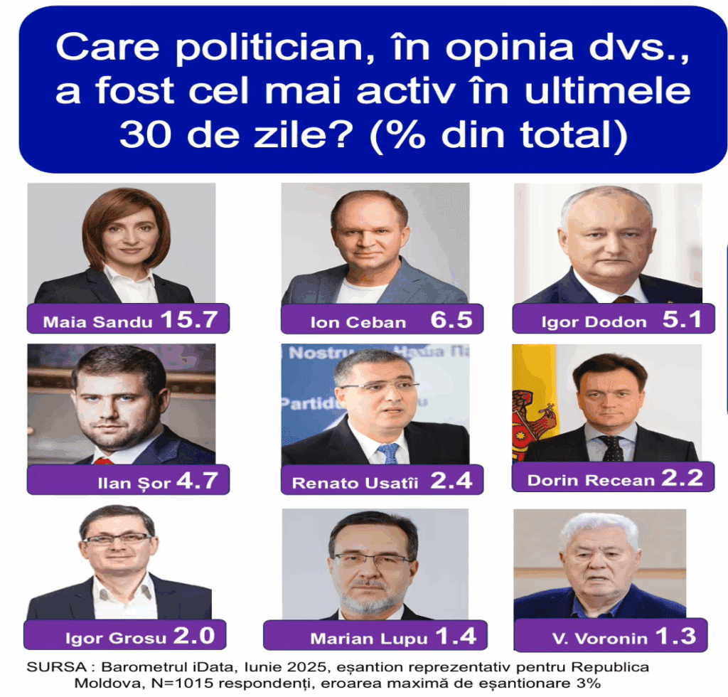 Что касается восприятия деятельности политиков, президент Майя Санду считается самой активной политической фигурой за последние 30 дней. За ней следуют мэр Кишинёва Ион Чебан и бывший президент Игорь Додон.
