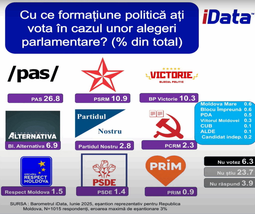Если бы в следующее воскресенье состоялись парламентские выборы, партия «Действие и солидарность» получила бы больше всего голосов — 26,8% от общего числа респондентов, что обеспечило бы ей 49 мандатов в парламенте. Это результаты барометра iData, проведённого в июне текущего года, передаёт IPN.