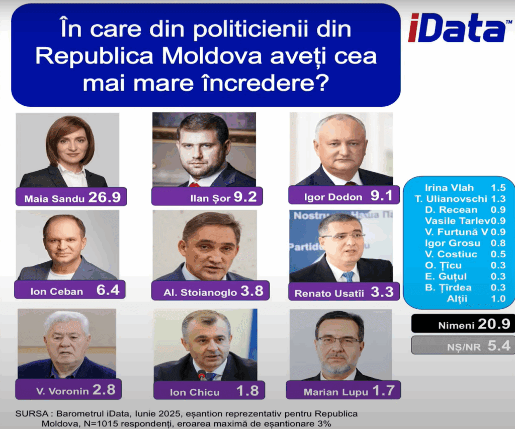 По уровню доверия Майя Санду также лидирует, оставаясь политиком, которому молдаване доверяют больше всего — 26,9%. Следом идут Илан Шор — с 9,2%, Игорь Додон — 9,1% и Ион Чебан — 6,4%. Далее в рейтинге — Александр Стояногло, Ренато Усатый, Владимир Воронин, Ион Кику и Мариан Лупу.