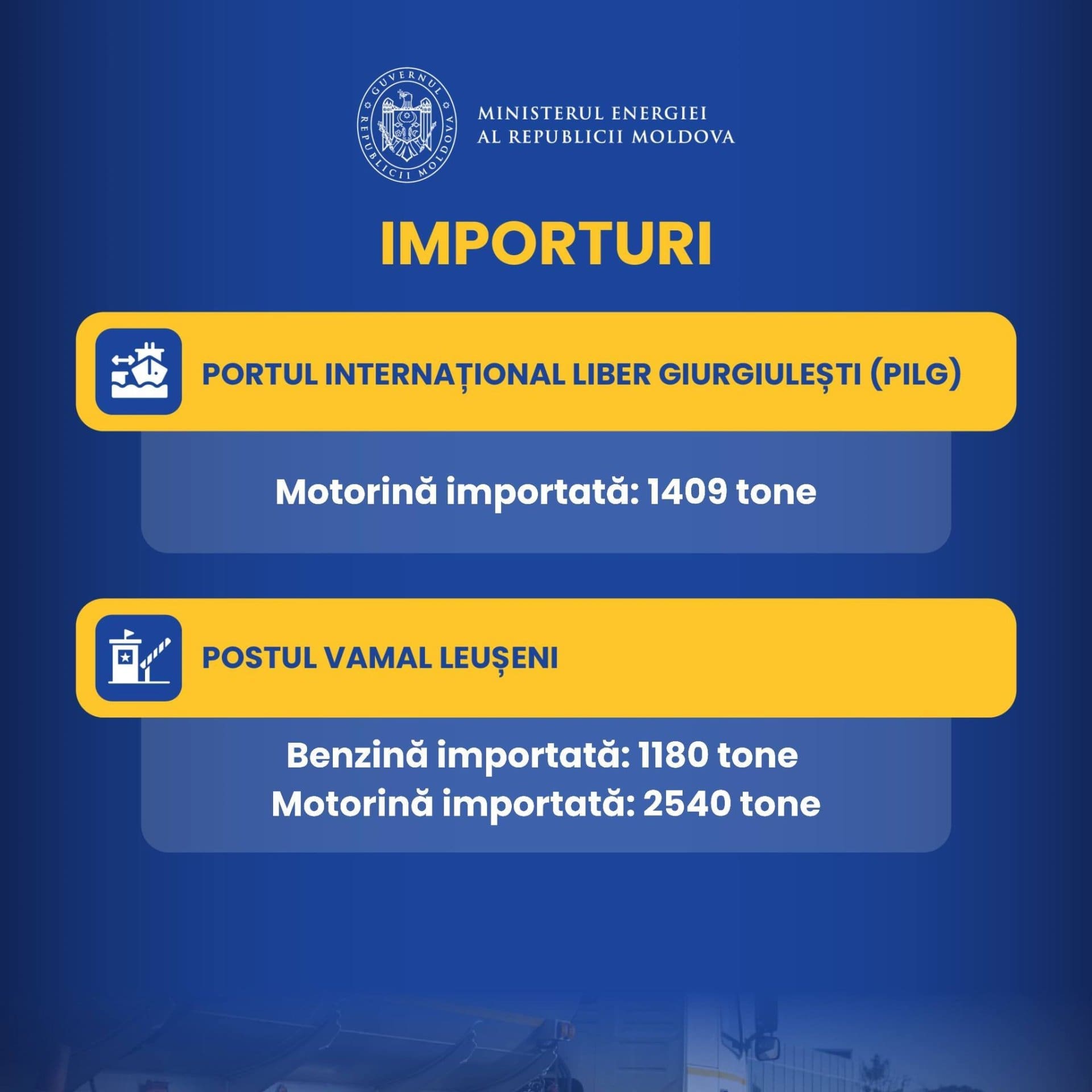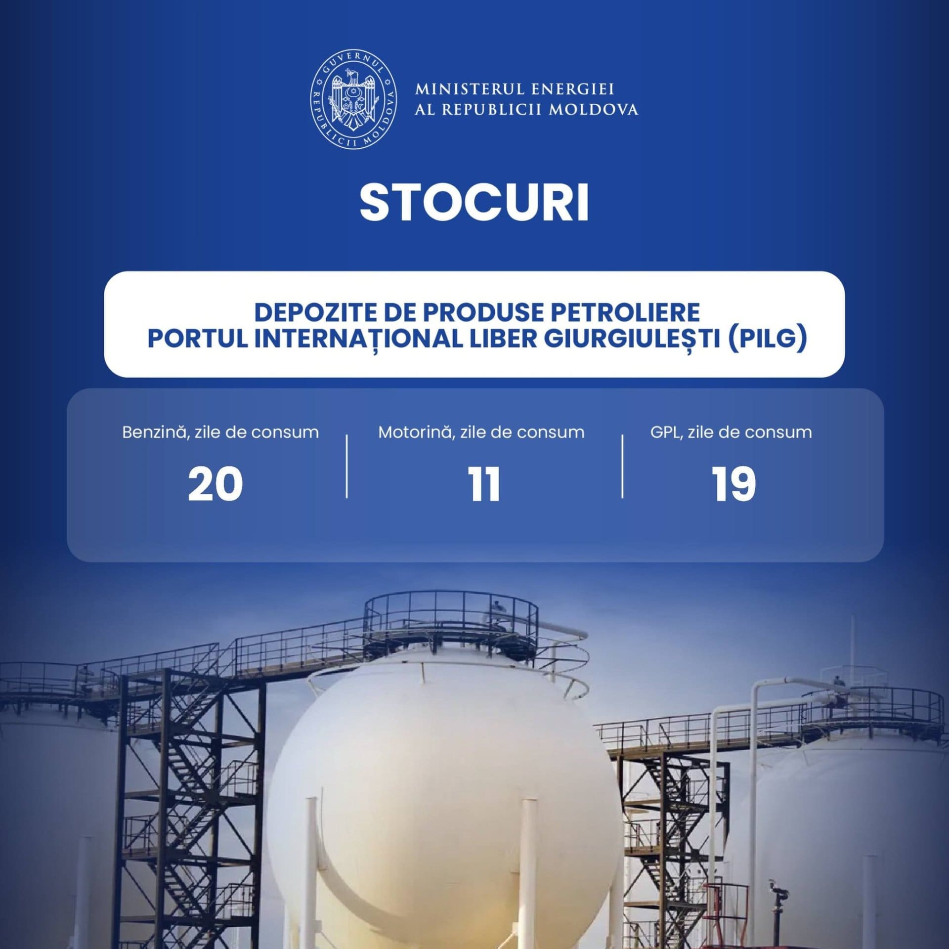 С 18 по 20 апреля в Республику Молдова было импортировано более 4 тысяч тонн дизельного топлива и почти 1200 тонн бензина. На 17 апреля запасы топлива составляли 20 дней потребления бензина, 19 дней сжиженного газа и 11 дней дизельного топлива.