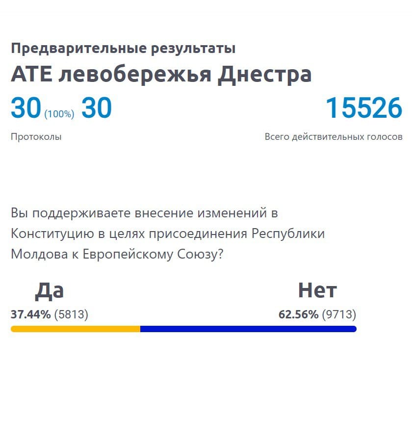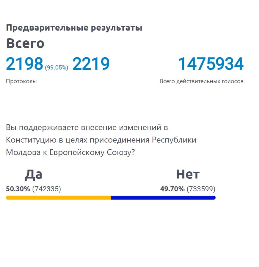 50, 3% избирателей ответили «ДА» на вопрос «Вы поддерживаете внесение изменений в Конституцию в целях присоединения РМ к ЕС». 49, 7 % голосовавших ответили отрицательно. Таковы предварительные данные после обработки 99,05 % бюллетеней.