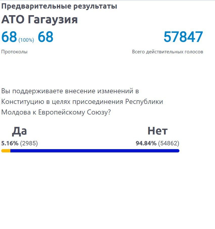 В АТО Гагаузия подавляющее большинство избирателей не поддерживают идею внесения изменений в Конституцию Республики Молдова. 94,8% проголосовали против.