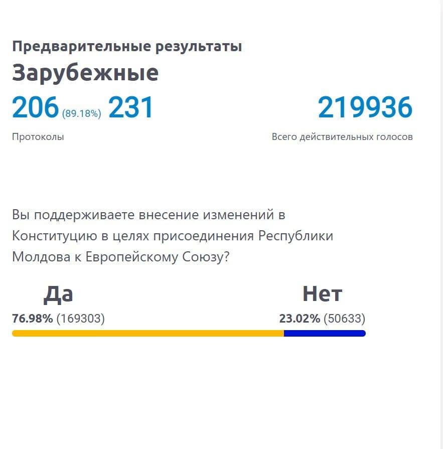 По предварительным данным ЦИК, 169303 граждан Молдовы, проживающих за рубежом поддержали  изменения в Конституции страны, против — 50633.