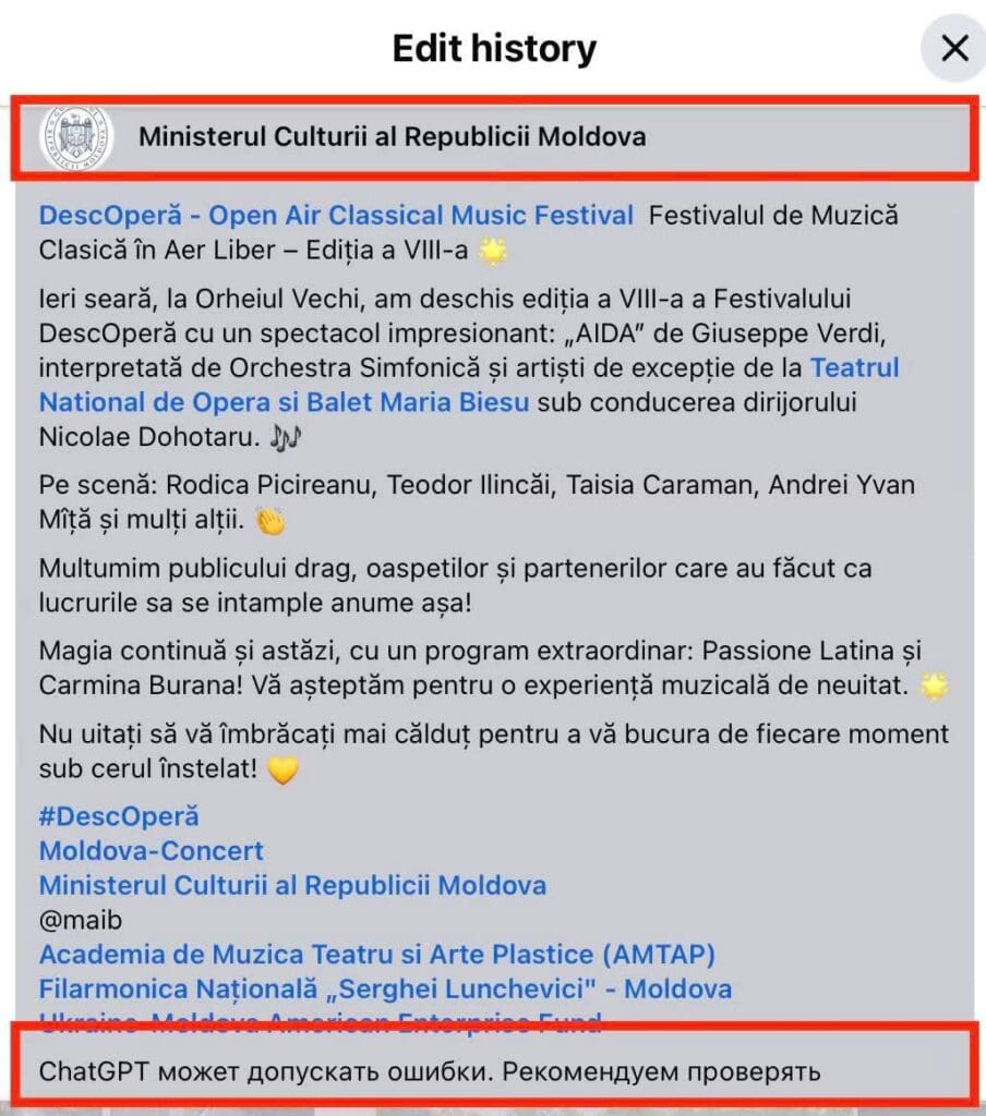 Министерство культуры опубликовало фотографии с фестиваля классической музыки DescOpera, кадры сопровождались текстом, в конце которого была фраза: «ChatGPT может допускать ошибки. Рекомендуем проверять». Подобная невнимательность в министерстве стала темой для обсуждения в соцсетях.