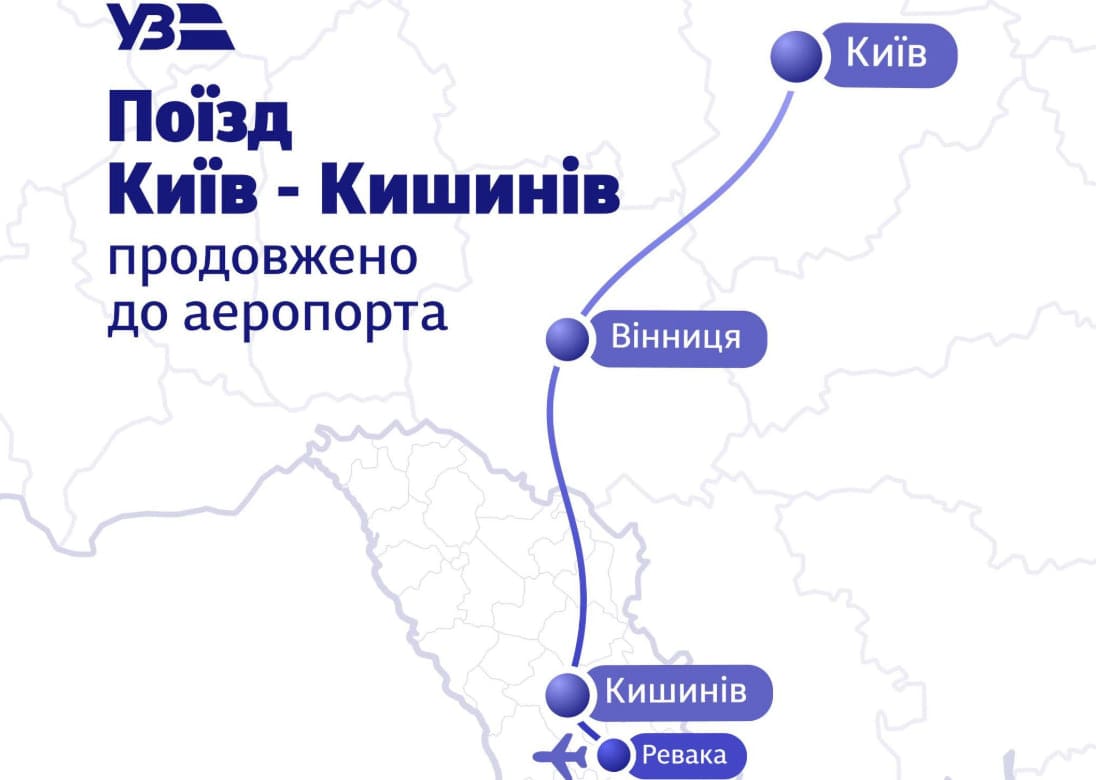«Укрзализныця» запускает прямой поезд из Киева в аэропорт Кишинёва. Маршрут поезда № 351 Киев — Кишинёв 13 апреля в тестовом режиме будет продлён до станции Ревака, которая находится в непосредственной близости от кишинёвского международного аэропорта.