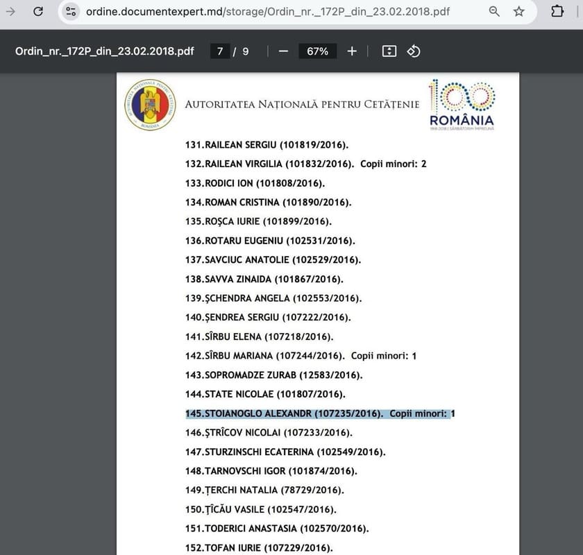 Вот выписка из приказа №172 от 23 февраля 2018 года Национального агентства по вопросам гражданства Румынии: гражданство предоставляется Александру Стояноглу, рождённому 3 июня 1967 года, а также двум его несовершеннолетним на тот момент дочерям — Кристине Стояноглу и Корине Стояноглу.