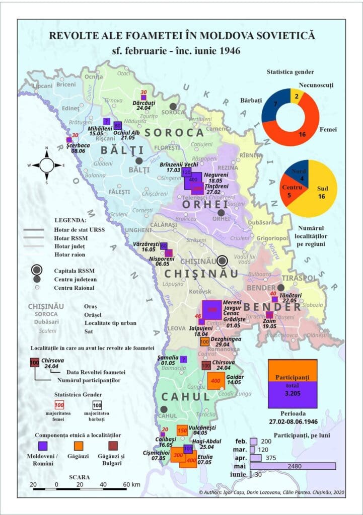 Историк Игорь Кашу опубликовал карту голодных восстаний в Бессарабии в 1946 году. Большинство участников примерно 30 бунтов были женщины, а первые признаки, предвещающие голод, появились ещё в феврале.