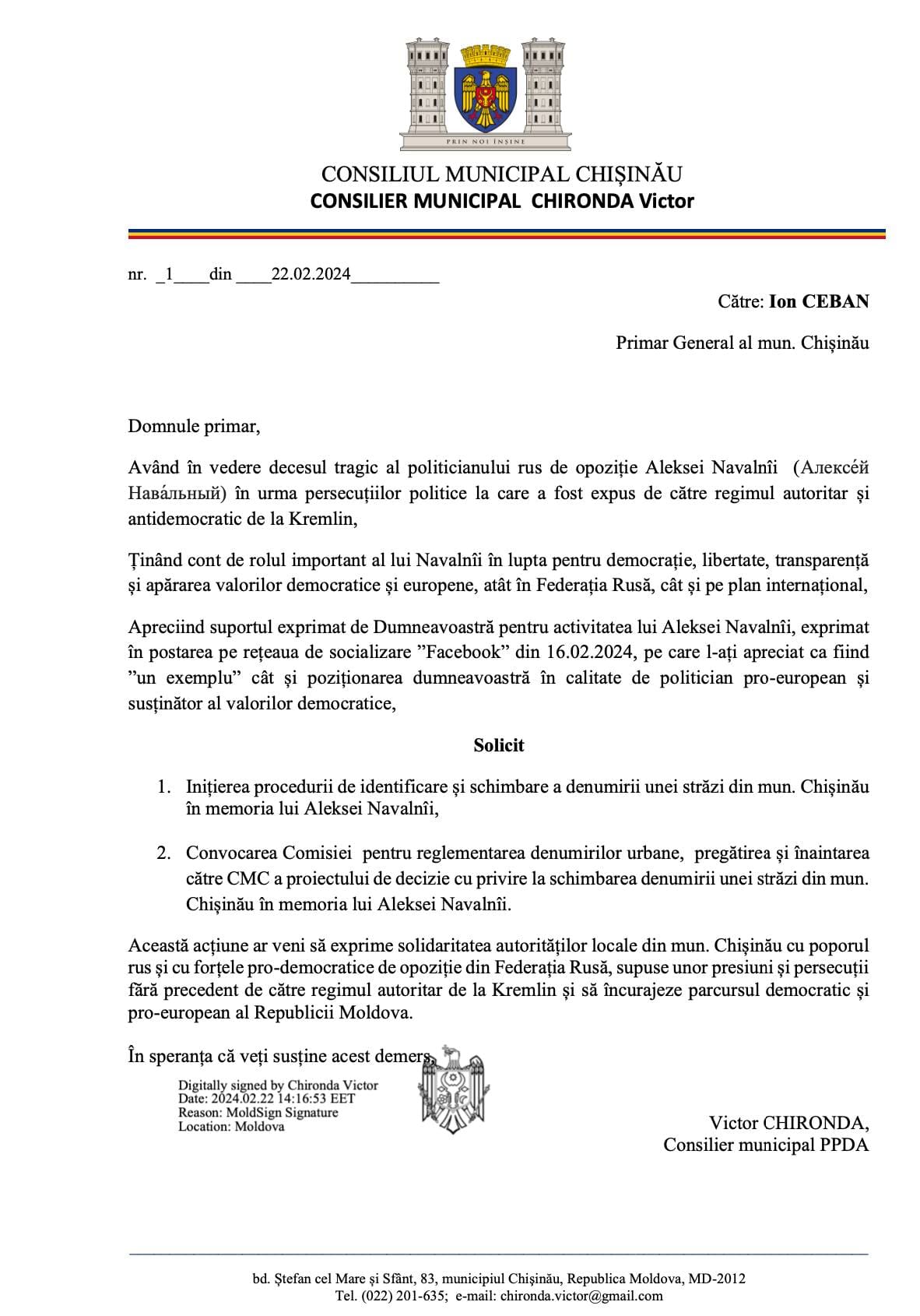 «Я ждал неделю, в надежде, что мэр сам выступит с подобной инициативой, поскольку 16 февраля он заявил, что «смелость Навального является примером». Но, возможно, он слишком занят. Я попросил мэра, как председателя Комиссии по регулированию городских названий, инициировать и подготовить проект решения МСК по изменению названия улицы в мун. Кишинев в память об Алексее Навальном», — написал Виктор Киронда в своем посту в соцсети.