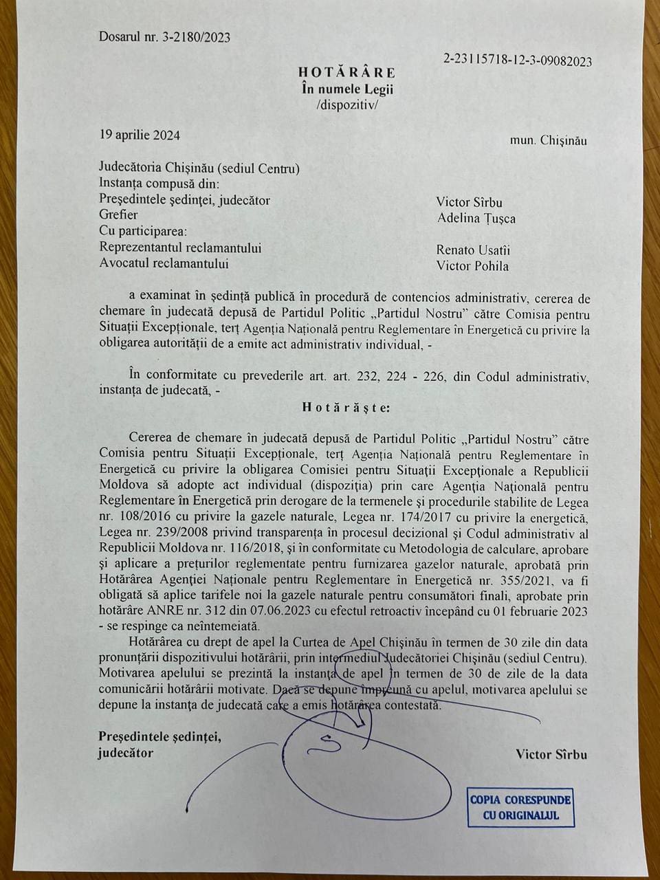 Суд столичного сектора Центр отклонил обращение лидера «Нашей партии» Ренато Усатого против Комиссии по чрезвычайным ситуациям, расценив его как необоснованное. Напомним, лидер НП требовал, чтобы Комиссия снизила тарифы на природный газ задним числом, то есть с 1 февраля 2023 года.