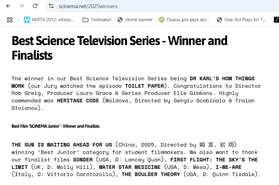 В программе SCINEMA 2025 в номинации «Лучший научный телевизионный сериал» жюри наградило австралийский сериал Dr Karl’s How Things Work, а упоминание «Highly commended» получила молдавская программа Heritage Code («Код Нации»), созданная Сергеем Скобиоалэ и Траяном Стояновым. Это признание означает, что эпизоды шоу будут включены в программу фестиваля и показаны в австралийских сообществах во время Национальной недели науки, а также будут доступны онлайн через защищённую ссылку.