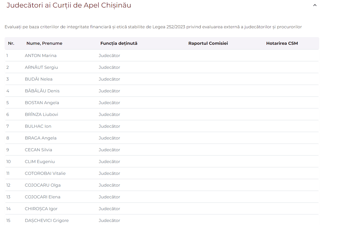 Комиссия Vetting приступает к оценке апелляционных судов и уже направила уведомления 40 судьям Апелляционной палаты Кишинева. Оценка этой категории субъектов будет осуществляться в соответствии с критериями финансовой и этической честности, установленными Законом № 252/2023.