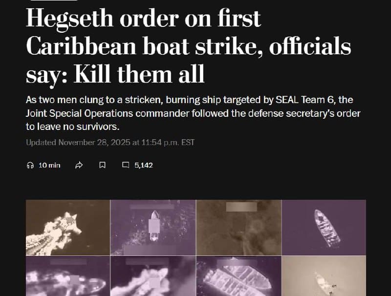 Конгресс США распорядился провести расследование сообщений СМИ о возможном нарушении международного права со стороны Пентагона. Причиной стала публикация The Washington Post, в которой утверждается, что министр обороны Пит Хегсет якобы отдал устный приказ уничтожить двух выживших моряков после удара по венесуэльской лодке, подозреваемой в перевозке наркотиков.