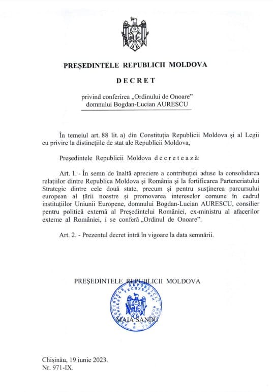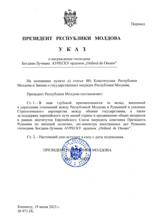 Президент Молдовы Майя Санду наградила бывшего министра иностранных дел Румынии Богдана Ауреску «Орденом почета». Указ об этом был подписан в понедельник, 19 июня.