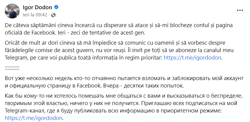 «Вот уже несколько недель кто-то отчаянно пытается взломать и заблокировать мой аккаунт и официальную страницу в Facebook. Вчера — десятки таких попыток. Как бы кому-то ни хотелось помешать мне общаться с вами и высказываться о беспределе, творимым этой властью, ничего у них не получится.», — сообщил Додон.
