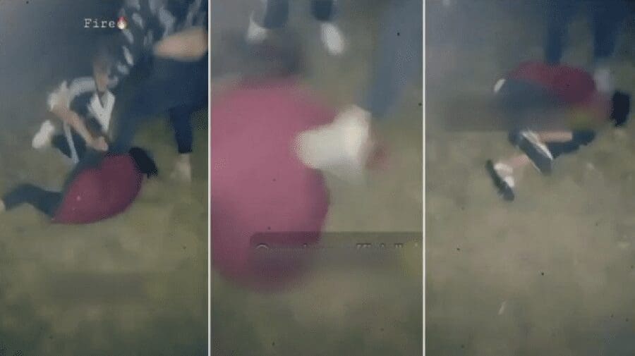 На кадрах видно, как девушку тянут за волосы, валят на землю и пинают ногами.