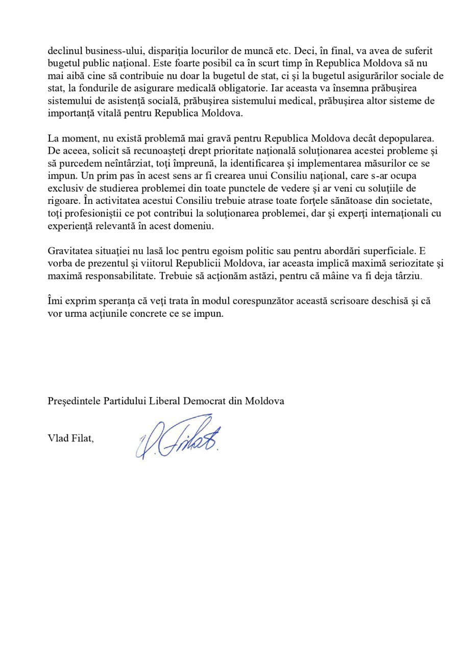 Председатель ЛДПМ Влад Филат обратился к президенту страны Майе Санду с просьбой создать национальный совет, который займется проблемой оттока населения. Свою просьбу он обозначил в открытом письме, которое опубликовал на своей странице в Фейсбуке.